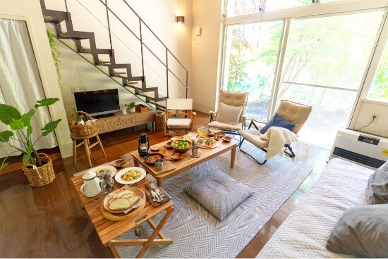 めいほう高原から車で5分。緑豊かな山あいにひっそり佇むコンドミニアム。1棟にリビング1部屋と寝室が3部屋。ゆったりとお寛ぎいただけます。
